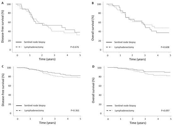 Survival outcomes did not differ significantly between the treatment groups when subdivided by lymph node status. As shown in Table 1, 27 (18.0%) of 150 women and 31 (16.6%) of 187 women had positive lymph nodes in the SLNB and LND groups, respectively. The 5-year DFS rates were 34.4% for patients treated with SLNB and 35.5% for patients treated with LND in the group of patients with positive lymph nodes (Figure 3A). This was not statistically different between the groups (p = 0.676). The 5-year OS was also similar between the two groups (Figure 3B, p = 0.608). The estimated 5-year OS rates were 37.0% and 48.4% for the SLNB and LND groups, respectively. Similarly, in the group of patients with negative lymph nodes, the staging approach did not influence the outcome. The 5-year DFS was 83.7% and 79.5% in SLNB and LND group, respectively, (Figure 3C, p = 0.361). The 5-year OS was 90.2% and 82.7% in SLNB and LND groups, respectively, (Figure 3D, p = 0.097).