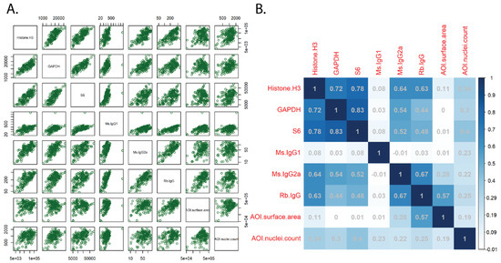 For the protein data, several different methods of normalization were compared to determine the most suitable. These included three housekeeping (HK) proteins (GAPDH, histone H3 and ribosomal protein S6), three immunoglobulin G (IgG) controls including (Ms IgG1, Ms IgG2a and Rb IgG), the number of nuclei, and the overall surface area. IgG and HK normalization account for both differences in ROI size and cellularity [25,26,27].