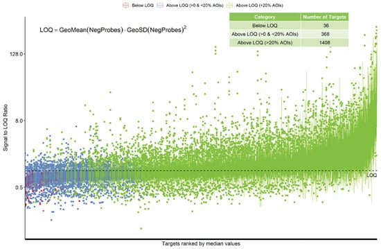 Normalization and QC of RNA data. Individual counts were normalized against the 75th percentile of signal from their own AOI (Q3 normalization) and the limit of quantification (LOQ) was calculated. The normalized signal to LOQ was plotted for each RNA target. Red = below LOQ, blue = above LOQ in less than 20% of AOIs, green = above LOQ in greater than 20% of AOIs. LOQ: limit of quantification.