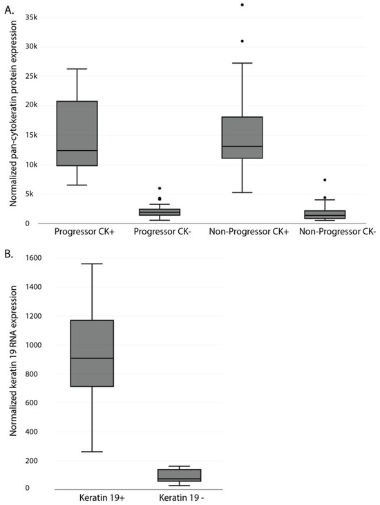 Segmentation of ROIs into Pan-CK+ and Pan-CK− AOIs. Slides were stained with the immunofluorescent morphology marker Pan-CK and used to segment selected ROIs into Pan-CK+ AOIs (Barrett’s epithelium) and Pan-CK- AOIs (surrounding stroma). Box plots show the normalized pan-CK protein expression (A) and keratin 19 RNA expression (B) of the different AOIs. Protein quantification was separated into progressing and non-progressing patients. CK: Cytokeratin.