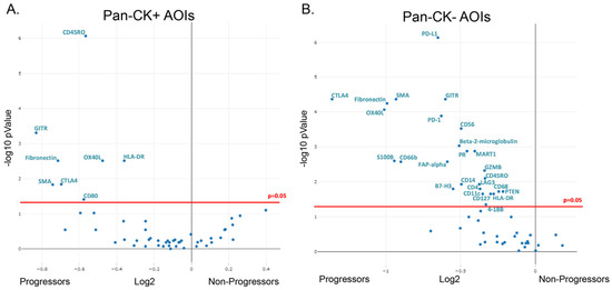 Differential protein expression in progressing and non-progressing BE patients. Volcano plots showing differential protein expression following Benjamini–Hochberg correction for multiple testing in pan-CK+ AOIs (A) and pan-CK− AOIs (B). CK: Cytokeratin.