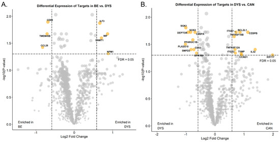 Differential RNA expression across stages of disease. Volcano plots showing differential RNA expression in non-dysplastic BE versus dysplastic samples (A) and dysplastic samples versus invasive EAC (B). BE: Barrett’s esophagus, DYS: Barrett’s esophagus with dysplasia, CAN: esophageal adenocarcinoma.