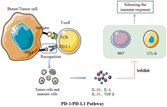 PD-1, primarily expressed on activated T cells’ surface, can combine with its ligand PD-L1, which presents expression on tumor cells and immune cells, to deprive T cells of killing ability. TCR receptors bind to specific MHC molecules of specific peptide chains, which is the first signal to activate T cells. However, PD-L1-to-PD-1 binding can suppress the function of lymphocytes and reduce the release of cytokines. It can also promote the apoptosis of lymphocytes (Figure 1). Immunosuppressive cells, occurring in BC tissues, take charge of releasing different negative regulatory factors and forming an immunosuppressive tumor microenvironment (TME) for preventing BC cells from being killed by CD8 + T cells. PD-L1-to-PD-1 binding is capable of limiting the activation and proliferation of tumor antigen-specific CD8+T cells [15]. Therefore, the function of CD8+T cells is inhibited, which may lead to the immune escape of tumors. Widespread acceptance as an immunosuppressive cytokine, interleukin-10 (IL-10), can diminish the antitumor immune response, thereby promoting tumor escape in the TME [16]. When bound to PD-1, PD-L1 can promote IL-10 expression, enhancing immunosuppress and thus leading to the escape of the tumor [17]. PD-1/PD-L1 inhibitors are capable of blocking PD-L1-to-PD-1 binding and reducing the immune escape phenomenon of tumors. Of course, we can also directly target the PD-L1 gene that modifies the tumor in order to significantly reduce or even inhibit its expression, thus avoiding the immune escape of the tumor [18]. At present, most of the immune drugs used to treat breast cancer target PD-1 or PD-L1.