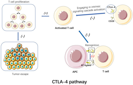 By blocking CTLA-4, CTLA-4 inhibitors can destroy the intrinsic signaling cascades. Thus, T cell proliferation is promoted, avoiding the immune escape of the breast tumor.