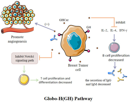 Globo H (GH), a kind of hexasaccharide (Fucα1–2Galβ1–3GalNAcβ1–3Galα1–4Galβ1–4Glc) obtained from the human BC cell line MCF-7 as a ceramide-linked glycolipid, is a representative TACA (tumor-associated carbohydrate antigen) (Figure 3). It exhibits high expression on BCs. GH can greatly help to regulate the tumor microenvironment and promotes tumor progression via multiple mechanisms [32]. Globo H Ceramide (GHCer) exists in the TME, and can be absorbed via tumor-infiltrating lymphocytes. Several studies have shown that GHCer may mediate tumor immune escape by inhibiting Notch1 signal transduction [33]. GHCer can also inhibit IL-2, IL-4 and IFN-γ to reduce the proliferation of CD19+B lymphocytes and human peripheral blood mononuclear cells (PBMC). As a result, the secretion of IgM and IgG, especially IgM, are greatly reduced. GHCer can also be incorporated into endothelial cells to promote angiogenesis [34]. According to this pathway, we expect to use the GH antigen vaccine to induce IgG antibody and T cell-dependent response, with the aim of blocking the immunosuppression of the tumor. However, several challenges had to be overcome before th e production of vaccines which are suitable for clinical use. In general, sugar chains often induce weak immunogenic responses, and the antibodies they engender typically have low affinity [35]. To overcome these challenges, researchers have developed multicomponent vaccines, including the glycan antigen, a carrier protein (e.g., keyhole limpet hemocyanin (KLH)), and an immunological adjuvant (e.g., QS-21) [35,36,37]. For example, an investigational immune stimulant (vaccine) comprising the Globo H hexasaccharide epitope is linked to the carrier protein keyhole limpet hemocyanin (KLH). The mechanism of action of KLH facilitates a more vigorous immune response given the weak antigen. Globo H induces anti-Globo H IgG and IgM that recognize Globo H expressed on the surface of 60–80% of breast cancer cells. The IgM antibodies recruit complements to attack the tumor cells, while the IgG antibodies guide NK cells to destroy the tumor [38].
