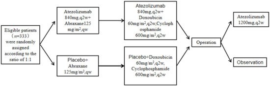 TNBC is characterized by strong invasive ability, poor prognosis, and few therapeutic targets. With the renewal of neoadjuvant therapy concepts and the continuous expansion of indications, patients with TNBC have also become a relatively preferred target population for neoadjuvant chemotherapy [1]. IMpassion031 compared efficacy and safety of atezolizumab versus placebo combined with nab-paclitaxel followed by doxorubicin plus cyclophosphamide as neoadjuvant treatment for early-stage TNBC (Figure 4). In their study, patients of newly-diagnosed stage II-III TNBC with tumor diameter >2 cm, aged ≥18 years, were randomly divided into two groups, with the experimental group containing 165 cases and the control group containing 168 cases. The experimental process is as follows:
