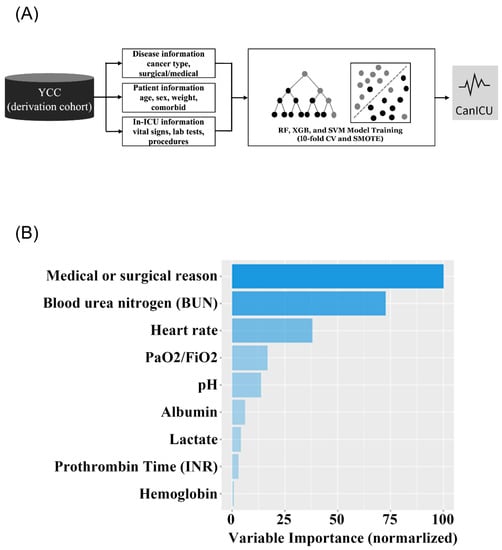Architectural overview and feature importance of CanICU: (A) Architectural overview of CanICU. (B) Feature importance for predicting 28-day mortality. YCC, Yonsei Cancer Center; RF, random forest; XGB, xgboost; SVM, support vector machine; CV, cross validation; SMOTE, synthetic minority oversampling technique. Evaluation of short term 28-Day mortality prediction in CanICU.