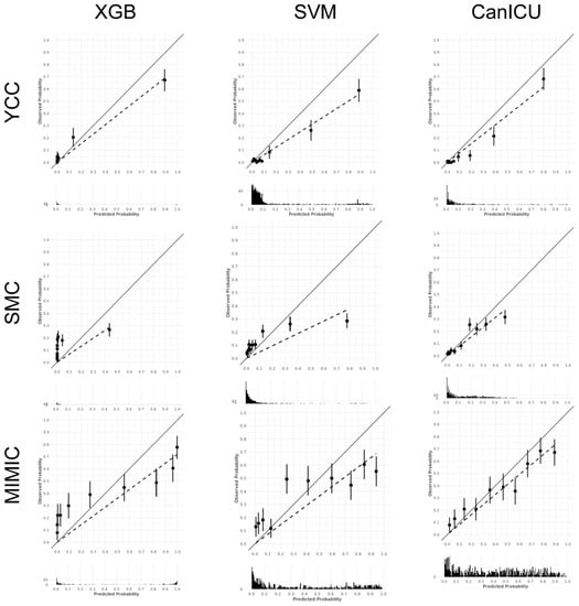 Calibration plots of the preliminary models and CanICU model for predicting 28-days mortality: XGB, xgboost; SVM, support vector machine; YCC, Yonsei Cancer Center; SMC, Samsung Medical Center; MIMIC, Medical Information Mart for Intensive Care.