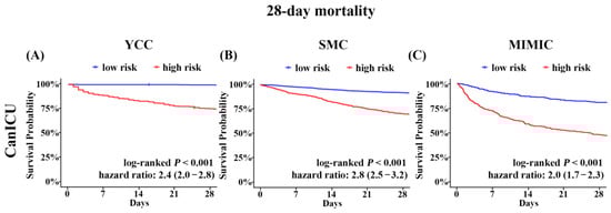 Kaplan-Meier curves according to predicted mortality by the CanICU model in each cohort. (A) 28-day survival probability of YCC validation cohort (n = 1072). (B) 28-day survival probability of SMC cohort (n = 2563). (C) 28-day survival probability of MIMIC-III cohort (n = 766). YCC, Yonsei Cancer Center; SMC, Samsung Medical Center; MIMIC, Medical Information Mart for Intensive Care.