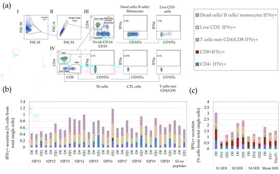 Vaccination-targeted and -untargeted secretion of IFNγ in ELISpot-like flow cytometry (ELF): PBMC from a glioma patient were cultured with or without tumor-specific peptides overnight and stained with a full FCM panel (see text). (a) Gating strategy of IFNγ secretion to tumor-specific peptides. The cells were analyzed by FCM and serially gated for (I+II) non-doublet/clumped single-cell gates; (III) live T cells (using a wide gate to include all activated T cells), live CD3- cells, and B cells / monocytes /dead cells (on a single dump channel); (IV) grouping into CD4+/ CD8+/ CD4-CD8- T cells. All cell populations were then gated for IFNγ secretion. Repeated 6 times using different sample sets. (b) Total IFNγ secretion to peptides (P11–20) in vaccine Set2 (S2) displayed by the cell subsets secreting IFNγ. (c) IFNγ secretion in response to SEB displayed by the cell subsets secreting IFNγ.