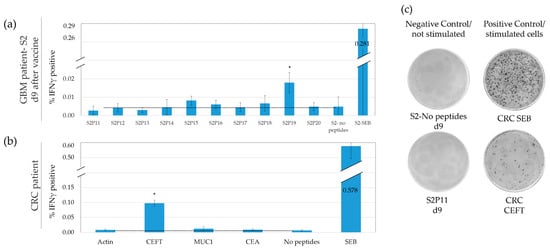 Monitoring responses to vaccinated peptides and to peptide pools using ELISpot: PBMC samples obtained from a glioma patient, 9 days after vaccination with set 2 vaccine (a) and PBMC from a CRC patient (b) were cultured with or without peptides/peptide pools, with the positive control CEFT peptide pool or with the SEB superantigen. Spot-forming units (SFU) were micrographed and quantified. (a) Mean and STD of triplicates from glioma vaccine set 2, (b) mean and STD of triplicates from a CRC patient. A dotted reference line was drawn from the no-peptides groups. An asterisk represents a response that is significantly different from the no peptides group (t-test, P < 0.05). (c) Representative micrographs of IFNγ ELISpot: positive control SEB and CEFT; response to specific peptides and to negative control-no peptides.