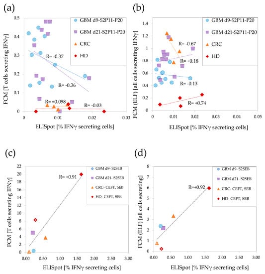 Correlation between ELISpot-measured responses to parallel FCM-measured ones: Responses to peptides in set 2 glioma vaccine (set2 peptides 11–20) in two time points (d9, d21), and responses to peptide pools in CRC and HD samples analyzed by FCM and ELISpot. (a) Summed CD4+ and CD8+ T-cell responses (FCM) correlated to ELISpot SFU frequencies. (b) All IFNγ+ responsive cells (FCM-ELF) correlated to ELISpot SFU frequencies. FCM (c) and FCM-ELF (d) correlations to ELISpot used to monitor responses to stronger antigens: CEFT and SEB. For each set of samples, Pearson’s correlation coefficient (R) was calculated, and a trend line was added.