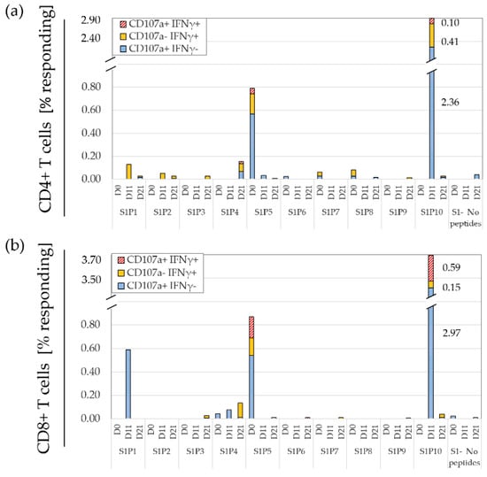 The addition of the CD107a to the panel enabled the identification of more responding peptides (two additional CD8 and two additional CD4 peptides per 30 peptides—see next section). CD107a demonstrated, using standard FCM, a considerably higher pre-activation background compared to IFNγ, especially in CD8+ T cells (CD8+ 0.085% ± 0.132%, CD4+ 0.065% ± 0.055%, n = 4). Note that the background responses for A-FCM presented above were calculated for cells that were positive for either IFNγ or CD107a or both.