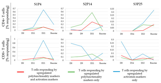 Figure 7 depicts CD4 and CD8 responses showing several different response dynamics. Depicted are the “net” functional responses, i.e., peptide response minus the no peptide background. It reveals that the booster vaccine had increased the extent of T-cell responses in some cases (S3P25), but not in others (S1P4).