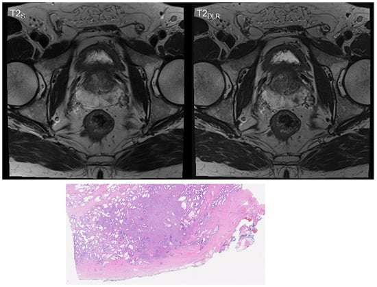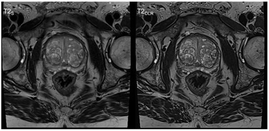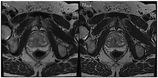 All examinations were performed using a 3T clinical MRI scanner (MAGNETOM Vida and Vidafit, Siemens Healthcare; Erlangen, Germany). The acquisition protocol consisted of standard T2-weighted TSE imaging (slice thickness: 3 mm) in 3 planes (T2S) followed by thin-slice (slice thickness: 2 mm) DLR axial T2-weighted TSE imaging (T2DLR). Subsequently, the remaining sequences of the mpMRI protocol were acquired (DWI, T1-weighted imaging, and dynamic contrast-enhanced (DCE) imaging). Acquisition time for axial T2S was 4:12 min as compared to 4:37 min for T2DLR. Detailed acquisition parameters are displayed in Table 1. For deep learning image reconstruction, an unrolled variational network [] was used that has been previously explored with a focus on acquisition time reduction [,]. The network was trained on more than 10,000 slices obtained from volunteer acquisitions using various clinical 1.5T and 3T scanners (MAGNETOM scanners, Siemens Healthcare, Erlangen, Germany), and integrated into the scanner reconstruction pipeline for prospective use.