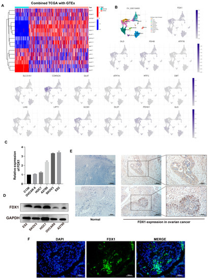 Expression of CRGs in OV. (A) Differential profile of expression of 16 CRGs in TCGA-OV and GTEx-ovary. (B) Expression of 16 CRGs at the cellular level based on GSE156400. (C) FDX1 expression in ovarian cell lines at the transcriptional and (D) protein levels. Immunohistochemical staining (E) and immunofluorescence (F) results of FDX1 protein in OV and normal samples. Original blots see Supplementary File S1.