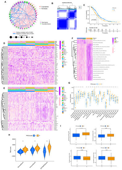 Prognosis subtypes identification. (A) Network diagram of 39 PRGs. (B) Consensus matrixes for all samples were clustered into specific subtypes (k = 2). (C) Prognostic differences between two subtypes. (D) Heatmap of the correlation of subtypes with clinical features. (E) Heatmap of the correlation of subtypes with ICPs. (F) GSVA analysis of two subtypes. (G) Overview of immune infiltration between the two subgroups. (* p < 0.05; ** p < 0.01; *** p < 0.001). (H) Different subtypes differ in immune microenvironment scores (stromal and immune scores). (*** p < 0.001). (I) Sensitivity of subtypes to the chemotherapeutic drugs.
