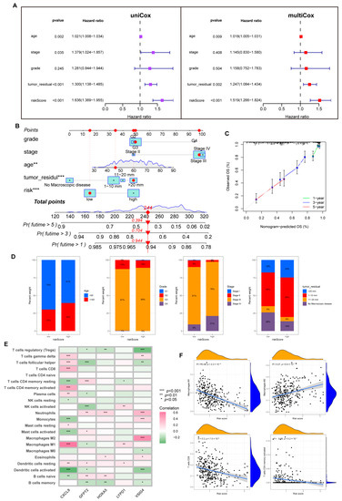 The predictive value of the risk model. (A) Uni-Cox and multi-Cox analysis between OS and related factors. (B) A nomogram was established for OS prediction. (** p < 0.01; *** p < 0.001). (C) Calibration curve for evaluating nomogram performance. (D) Overview of clinical information for different risk individuals. (E) Correlation of five hub genes and immune cell infiltration. (F) Risk score correlation of immune infiltration abundance.