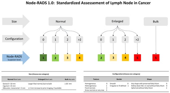 - Elsholtz, F.H.J.; Asbach, P.; Haas, M.; Becker, M.; Beets-Tan, R.G.H.; Thoeny, H.C.; Padhani, A.R.; Hamm, B. Introducing the Node Reporting and Data System 1.0 (Node-RADS): A Concept for Standardized Assessment of Lymph Nodes in Cancer. Eur. Radiol. 2021, 31, 6116–6124. [Google Scholar] [CrossRef]