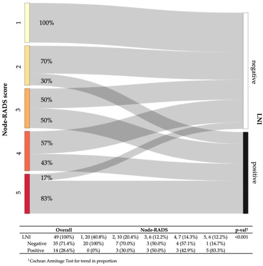 At a patient level, the overall LNI rate was 29% (14/49). Based on the blinded CT image evaluation, 20 (40.8%) vs. 10 (20.4%) vs. 6 (12.2%) vs. 7 (14.3%) vs. 6 (12.2%) of patients were assigned a Node-RADS score 1 vs. 2 vs. 3 vs. 4 vs. 5, respectively. Following the stratification according to the Node-RADS scores, the LNI rates ranged from 0 to 83.3% with increasing scores (p < 0.001) (Figure 2). At a lymph node level, the overall LNI rate was 8.7% (34/396). Based on a blinded CT image evaluation, 208 (53.1%) vs. 134 (34.2%) vs. 22 (5.6%) vs. 12 (3.1%) vs. 16 (4.1%) of patients were assigned a Node-RADS score 1 vs. 2 vs. 3 vs. 4 vs. 5, respectively. Following the stratification according to the Node-RADS Sscores, the LNI rates ranged from 0 to 75.0% with increasing scores (p < 0.001) (Supplementary Table S1).