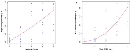Local polynomial smoother function (LOESS) depicted the predicted probability of lymph-node invasion (LNI) according to the Node-RADS score at the patient level (A) and at the lymph node level (B). Predicted probability was derived from a multivariable logistic regression model accounting for important cofounders (age, cT stage, and concomitant CIS at last TURBT).
