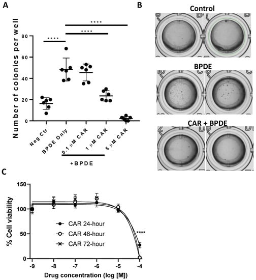 As an initial step to examine our hypothesis regarding the preventive activity of carvedilol against B(a)P-induced lung carcinogenesis, we used an anchorage-independent growth assay in the soft agar to evaluate the malignant transformation of BEAS-2B cells. BEAS-2B is a non-tumorous human bronchial epithelial cell line which is sensitive to transformation by B(a)P or BPDE [26,36]. BPDE at 0.2 µM significantly induced colony formation (Figure 1A,B), and, therefore, was used in the soft agar assay to examine the cancer preventive activity of carvedilol. As shown in Figure 1A, carvedilol inhibited BPDE-induced cell transformation in a dose-dependent manner. At the concentrations of 1.0 and 5.0 μM, carvedilol significantly attenuated the number of colonies in soft agar compared to the BPDE-only control. An MTT assay on the BEAS-2B cells confirmed that concentrations at 10 µM or lower did not significantly affect cell viability at up to 72 h of incubation (IC50 value was estimated as 25 µM for the 72-h time point) (Figure 1C).