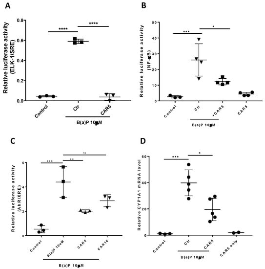 Previous studies demonstrated that carvedilol attenuated epidermal growth factor (EGF)-induced ERK nuclear translocation in epidermal cells JB6 P+ and activation of ERK-regulated ETS transcription factor (ELK-1) in HEK-293 cells [37]. ELK-1 is a transcription factor that regulates gene expression via the serum response element (SRE) in the promoter regions and its activation in response to mitogen-activated protein kinases (MAPKs) [38]. As ELK-1 has been associated with lung carcinogenesis [39,40], a dual luciferase assay was used in the BEAS-2B cells to evaluate the ELK-1-regulated SRE activity. As can be seen from Figure 2A, B(a)P at 10 μM strongly induced ELK-1 activation, while the treatment with carvedilol (5 μM) reversed the activity of the ELK-1/SRE to the same level of the negative controls (Figure 2A).