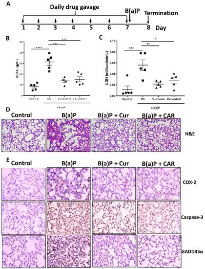 Effects of carvedilol on B(a)P-induced lung toxicity. (A) Experimental design. The CD-1/IGS mice were pretreated with carvedilol (20 mg/kg/day) or curcumin (100 mg/kg/day) by oral gavage for 7 days before B(a)P exposure. The mice were euthanized 24 h after B(a)P exposure. (B) Effects of carvedilol and curcumin on B(a)P-induced plasma levels of malondialdehyde (MDA), a marker to assess lipid peroxidation (LPO). (C) Effects of carvedilol and curcumin on B(a)P-induced plasma levels of lactate dehydrogenase (LDH), a marker for tissue damage. (D) Effects of carvedilol on B(a)P-induced histopathologic changes. H&E staining of mouse lung sections of the lung (×20). Scale bar: 100 μm. (E) IHC analysis for expression of COX-2, caspase-3 and GADD45α (×20). Scale bars: 100 μm. Data plotted are mean + SD. An ordinary one-way ANOVA followed by Dunnett’s multiple comparison test was used to assess statistical differences. *: p < 0.05, **: p < 0.01, ***: p < 0.001, ****: p < 0.0001.