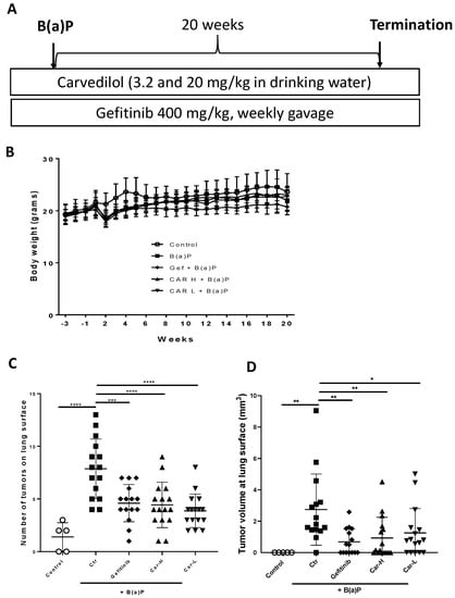 Female A/J mice (Jackson Lab), 8 weeks old at the beginning of the experiment, were randomly divided into the following five groups: (1) negative control group without B(a)P exposure (n = 5); (2) B(a)P-only group (n = 17); (3) positive control group exposed to B(a)P and treated with gefitinib (n = 16); (4) exposed to B(a)P and treated with 3.2 mg/kg carvedilol (n = 16); and (5) exposed to B(a)P and treated with 20 mg/kg carvedilol (n = 16). The drug treatment in groups 3, 4 and 5 started three weeks before the B(a)P exposure. The dose of gefitinib was 400 mg/kg, based on previous work [29], in which gefitinib was given by oral gavage in corn oil once a week until the end of experiment.