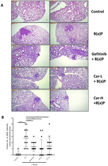3.4. Effects of Carvedilol on B(a)P-Induced Lung Carcinogenesis in Mice