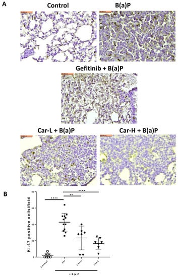 The representative microscopic images of H&E-stained lung cross-sections showed distinct tumors in B(a)P-exposed lungs (Figure 5A). The quantification of tumor numbers in a cross-sectional area indicates the same changes as the lung surface tumor counts (Figure 5B). In the lungs of mice treated with gefitinib or carvedilol (both doses), the Ki-67 positive cells were significantly reduced compared to the mice exposed to B(a)P alone (Figure 6A,B).