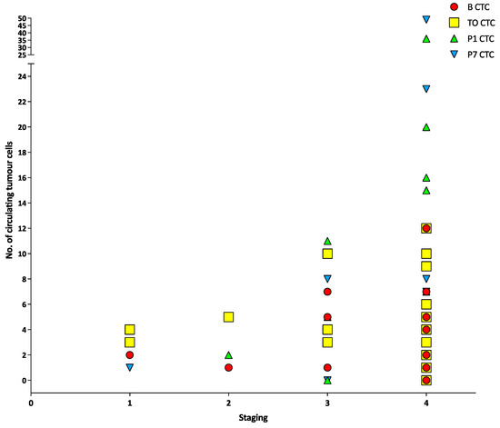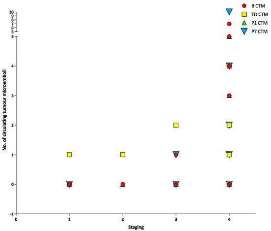 There was no correlation between tumour staging and CTCs, CTM or CTECs at any timepoint (all p > 0.05) (Figure 1, Figure 2 and Figure 3). There was a positive correlation between the number of CTCs at baseline and the number of CTCs at the tumour-out timepoint (Spearman’s ρ 0.7433, p < 0.0001) (Figure 4). There was a weak positive correlation between the number of CTM at baseline and the number of CTM at the tumour-out timepoint (Spearman’s ρ 0.4871, p = 0.0184). No such correlations were seen with CTECs.