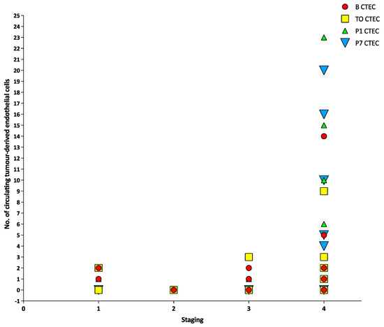 Number of circulating tumour-derived endothelial cells at different timepoints versus different tumour stages.
