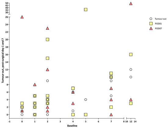 At baseline, CTCs were detected in 92% (20/22) of patients. Twelve patients showed a higher number of CTCs at the tumour-out timepoint compared to baseline, while nine patients showed a higher number of CTCs at the tumour-out timepoint compared to day 7 post-surgery. Nineteen and 17 patients had detectable number of CTCs at day 1 and day 7 post-surgery.
