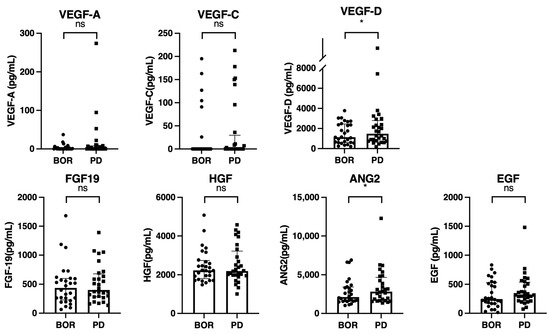Changes in the growth factors between the baseline and best overall response points (n = 32). Serum median VEGF-A, VEGF-C, VEGF-D, FGF-19, HGF, ANG-2, and EGF levels were compared between the baseline and best overall response points in all cohorts. The bar graph shows the median serum growth factor levels with an interquartile range indicating the error bars. Asterisks indicate statistically significant differences (* p < 0.05, **** p < 0.0001). ns, not significant. VEGF, vascular endothelial growth factor; FGF-19, fibroblast growth factor-19; HGF, hepatocyte growth factor; ANG-2, angiopoietin-2; EGF, epidermal growth factor; BOR, best overall response.