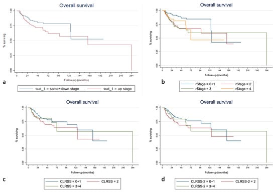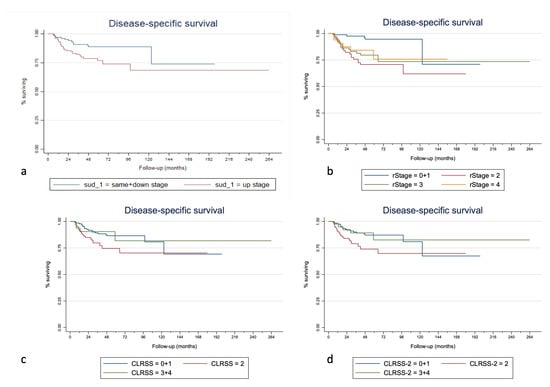 Given the small number of down-stage patients (n = 14), the definitive analyses for the SUD staging system were carried out by comparing up-stage vs. down/same-stage patients (merged into a single group and taken as a reference). For the same reason, we merged stages 0 and I and stages III and IV of the CLRSS and CLRSS-2 classifications into single categories, as well as patients coded as 0 and I according to the rTNM classification.