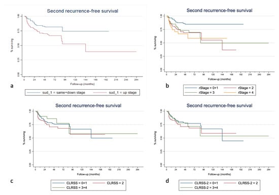 Kaplan–Meier curves for second-recurrence-free survival stratified for the SUD (a), rTNM (b), CLRSS (c), and CLRSS-2 (d) staging classes (merged as the analyses were performed).
