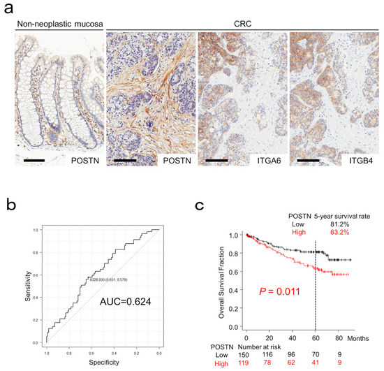 Expression and survival significance of periostin (POSTN) in colorectal cancer (CRC). (a) POSTN was weakly expressed on mesenchymal cells of non-neoplastic colonic mucosa. Note that non-neoplastic epithelial cells were negative for POSTN. Cancer-associated fibroblasts, but not CRC cells, expressed POSTN. ITGA6 and ITGB4, the canonical receptors for POSTN, were expressed in CRC cells. Bar, 100 µm. (b) ROC curves for POSTN expression on the patient survival at 5 years. (c) Kaplan–Meier curves for patients classified by stromal POSTN expression.