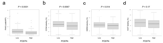 In the association with cellular proliferation markers, POSTN showed significantly inverse associations with PHH3, CCNA, and GMNN. No significant association was detected between POSTN and Ki-67 labeling index (Figure 2).