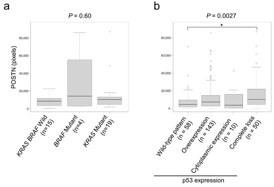 Regarding KRAS and BRAF mutation status, BRAF mutants tended to show higher POSTN expression (Figure 3a). Based on the usefulness of p53 immunohistochemistry as a surrogate marker to predict TP53 mutation status, we classified our cohort according to p53 expression status as follows: wild type, overexpression, cytoplasmic, and complete loss. Among them, patients with p53 complete loss tumors showed significantly higher POSTN expression than those with p53 wild-type pattern (Figure 3b).