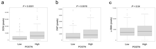 CAFs are heterogeneous and present various gene expression patterns. Recent studies identified several markers specifically expressed in CAFs [23]. In the present study, to characterize POSTN-positive CAFs, the association between POSTN and α-SMA, FAP, or DCN was analyzed. Among these, DCN and FAP were significantly associated with POSTN expression. In contrast, no significant association was identified between α-SMA and POSTN (Figure 4).