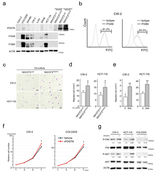 Effects of POSTN on CRC cells. (a) Immunoblot analysis showing POSTN and ITGs in CRC and NIH/3T3 cells. (b) Results for FACS analyses showing ITGA6 and ITGB4 expression on CW-2 cells. (c–e) Results of migration assays showing that co-culture with NIH/3T3POSTN or addition of rPOSTN in the lower chamber accelerated the migration of CRC cells. Bar = 100 µm. Assays were performed in quadruplicate. Data are shown as mean ± S.D. *, p < 0.05, **, p < 0.01. (f) Addition of rPOSTN to the culture medium enhanced the proliferation of CRC cells. Assays were performed in triplicate. Data are shown as mean ± S.D. *, p < 0.05. (g) Immunoblot analysis showing upregulated P-FAK and P-AKT in rPOSTN-stimulated CRC cells. The uncropped bolts are shown in Supplementary Material File S1.