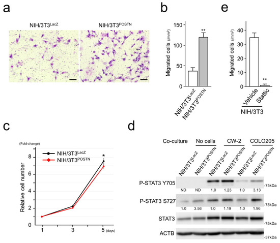 It was reported that cancer cells and fibroblasts communicate with each other. To reveal the communication between CRC cells and fibroblasts in vitro, we performed co-culture assays. Co-culture with CRC cells upregulated the basal expression levels of STAT3 in NIH/3T3 cells. Furthermore, upregulation of phosphorylated STAT3 at tyrosine 705 (Y705) was observed in NIH/3T3 cells co-cultured with CRC cells (Figure 6d). Note that NIH/3T3POSTN expressed higher levels of phosphorylated STAT3 at Y705 than NIH/3T3LacZ. Stattic, a selective STAT3 inhibitor significantly suppressed the migration of NIH/3T3 (Figure 6e).