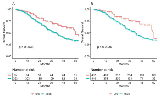 The median follow-up was 43 months (IQR 22–66). In terms of survival, the median OS was 60 months (95% CI: 51-NA) and 41 months (95% CI: 34–46) for UPS and NEOS, respectively (p = 0.0036). The observed survival curve is represented in Figure 1A.