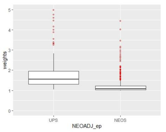 All the preoperative and oncologic variables that were significantly different between the two groups were employed to make an IPW obtain two well-weighted pseudo-populations. After that, the UPS group was composed of 432.17 pseudo-patients and the NEOS of 439.85. The balance after weighting among variables is depicted in Figure 2 (boxplot of the weights) and Appendix A, Table A1 (mean differences among variables before and after the weighting).