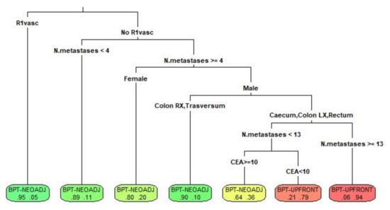 To better select patients who should be candidates for BPT-NEOS or BPT-UPS according to our model and to create homogeneous groups, a CART tree was developed. The method selected to prune the algorithm considered the following variables, in order of importance in determining the allocation: planned R1vasc, number of intrahepatic metastases, colon tumor localization, CEA, and sex. The decision tree is depicted in Figure 4, reporting the estimated probability to be assigned to both treatments per leaf. After applying the CART model to the test population, the accuracy rate was 88.6%.