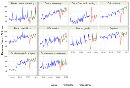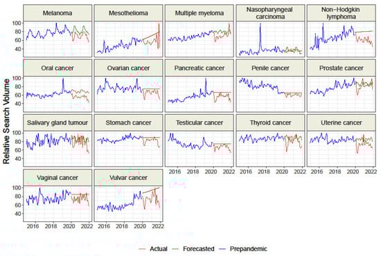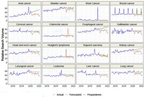 We collected data for n = 9 representing cancer-related screenings and “HPV vaccine” and for n = 33 topics representing malignancies. Overall, the raw difference between the actual and forecasted RSV for all topics but “HPV vaccine” was negative, which suggests a decrease in interest than the forecasted trend based on GT data from 2015–2019 (Table 1 and Table 2, Figure 1, Figure 2 and Figure 3). The sorted raw difference is presented in the Supplementary Figures S1 and S2.