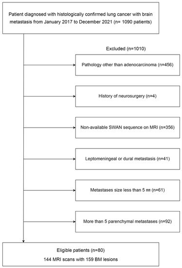 This retrospective study was approved by the institutional review board, which waived the requirement for informed patient consent (3-2021-0418). We retrospectively searched electronic medical records to identify magnetic resonance imaging (MRI) sets of patients with histologically confirmed lung cancer and BM from January 2017 to May 2022. After identifying 1090 potential participants, the following exclusion criteria were applied: (1) histologic subtypes of primary lung cancer other than adenocarcinoma (n = 456), (2) history of neurosurgery (n = 4), (3) lack of susceptibility-weighted angiography (SWAN) MRI of the brain for evaluation of the hemorrhage (n = 356), (4) leptomeningeal or dural metastasis (n = 41), (5) absence of “evaluable BM” for the hemorrhage (n = 61), and (6) more than five BMs in a patient, as clustered data may lead a statistical bias (n = 92). “Evaluable BM” was defined as BM where the longest diameter was >5 mm. After the exclusion criteria were applied, a total of 80 patients with 144 MRI scans and 159 BMs were included in this study (Figure 1).