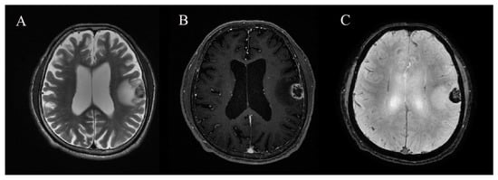 A 67-year-old man with hemorrhagic brain metastasis (BM) in left frontoparietal lobe. (A) T2-weighted imaging, (B) contrast-enhanced 3D T1-weighted imaging, and (C) susceptibility-weighted angiography (SWAN).