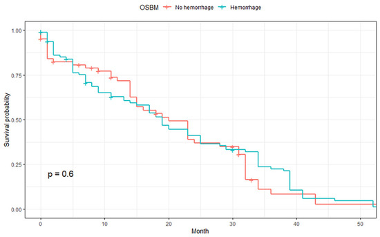 The median OSBM was 23.0 months, and no significant difference in OSBM was observed between those with non-hemorrhagic and hemorrhagic BMs (p = 0.6, Figure 3). In subgroup analyses, there was no significant difference in OSBM depending on intracranial hemorrhage in patients with single BM (p = 0.42) as well as multiple BMs (p = 0.8, Supplemental Figure S1).